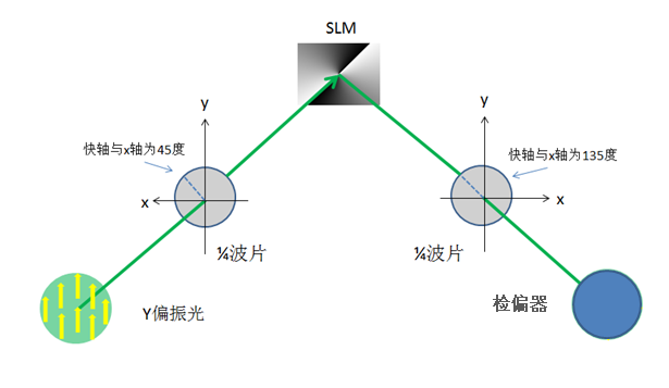 雖然濱松的SLM是相位調(diào)制器,但是通過(guò)恰當(dāng)?shù)呐渲靡彩强梢詫?shí)現(xiàn)的,可以通過(guò)在前后添加相應(yīng)的1/4玻片,偏振片等來(lái)實(shí)現(xiàn),如下圖是一個(gè)常見(jiàn)的調(diào)制幅度的光路構(gòu)型。 |