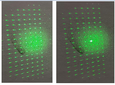 零級(jí)光是由于SLM表面玻璃反射,像素間隔之間的反射,以及相位圖本身效率不高導(dǎo)致的。所以消除零級(jí)光的方式首先是改進(jìn)算法,如下圖是分別使用GSW算法(左圖)和GS算法(右圖)計(jì)算點(diǎn)陣得到的結(jié)果,可以看到由于GSW計(jì)算的相位圖有更高的衍射效率,所以0級(jí)光相比于GS算法得到的結(jié)果顯然更佳微弱。 |